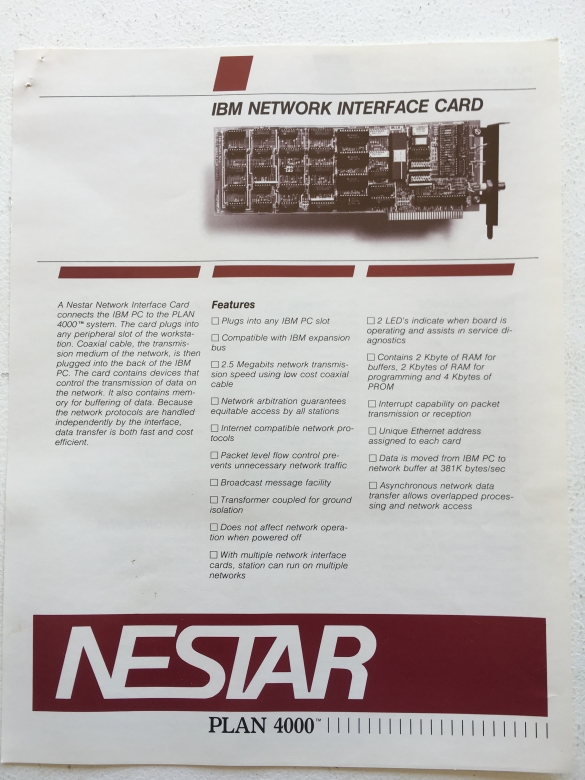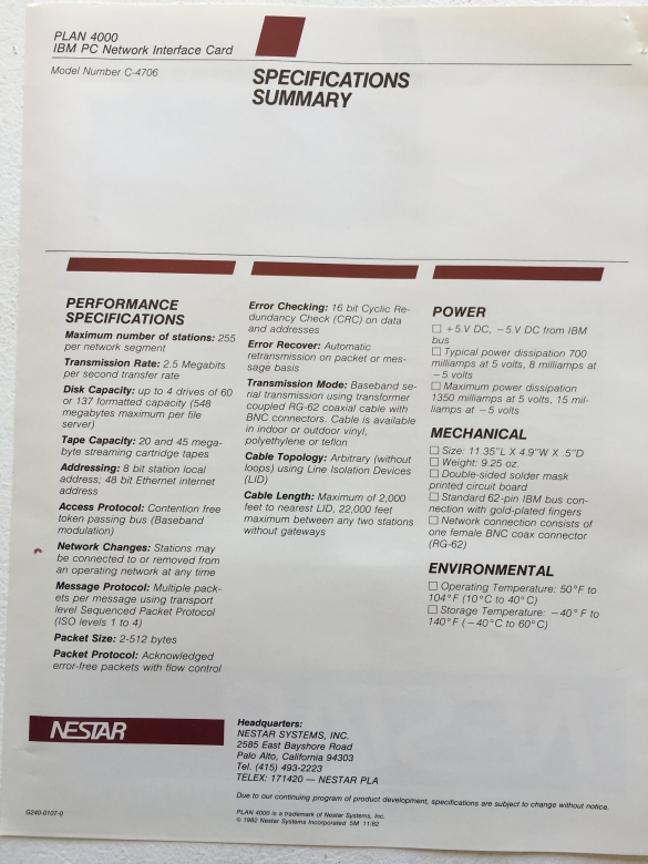 Nestar Plan 4000 PC Network Interface Card Spec Summary