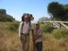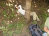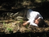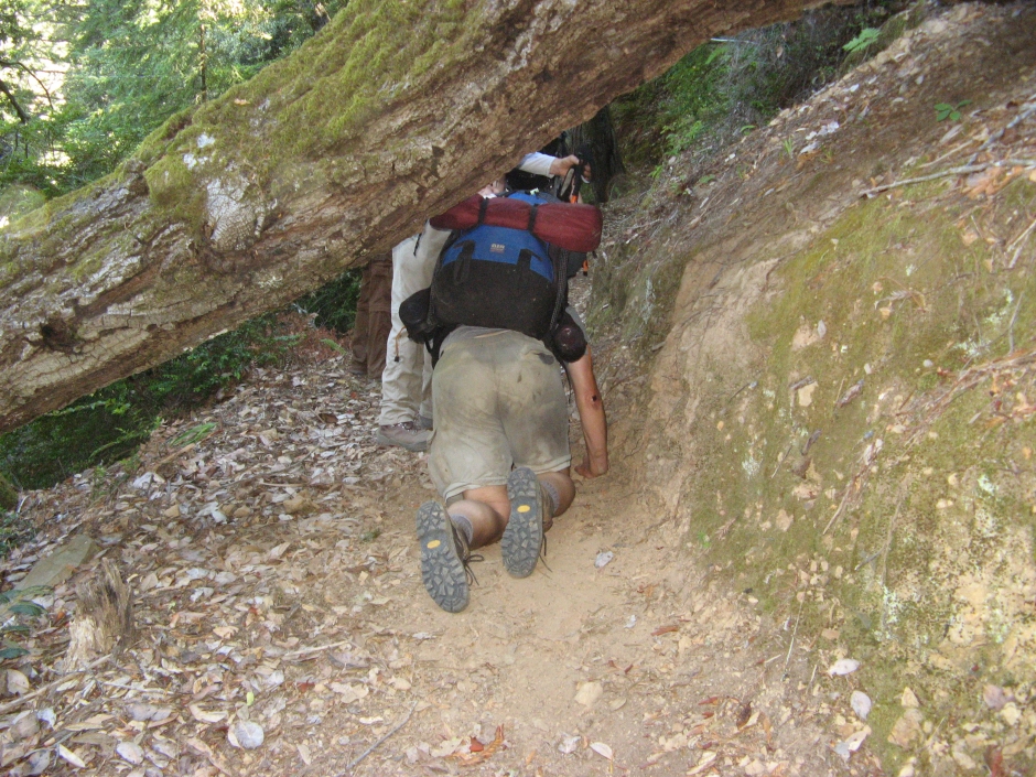 33 Tom crawling under fallen tree.