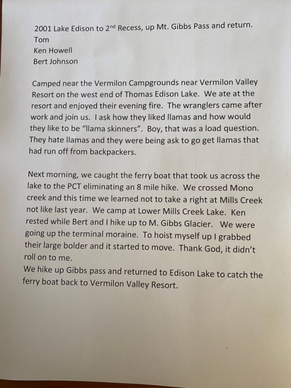 2001 Lake Edison to 2nd recess and back. TKB